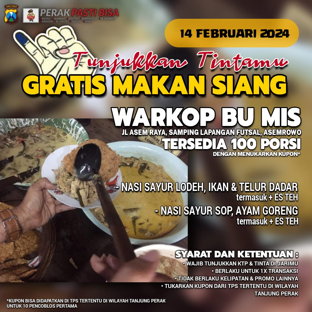 Artikel Polres Pelabuhan Tanjung Perak Siapkan paket Makan Siang Gratis Usai Coblosan pertama kali tampil pada Harian Merdeka Post.